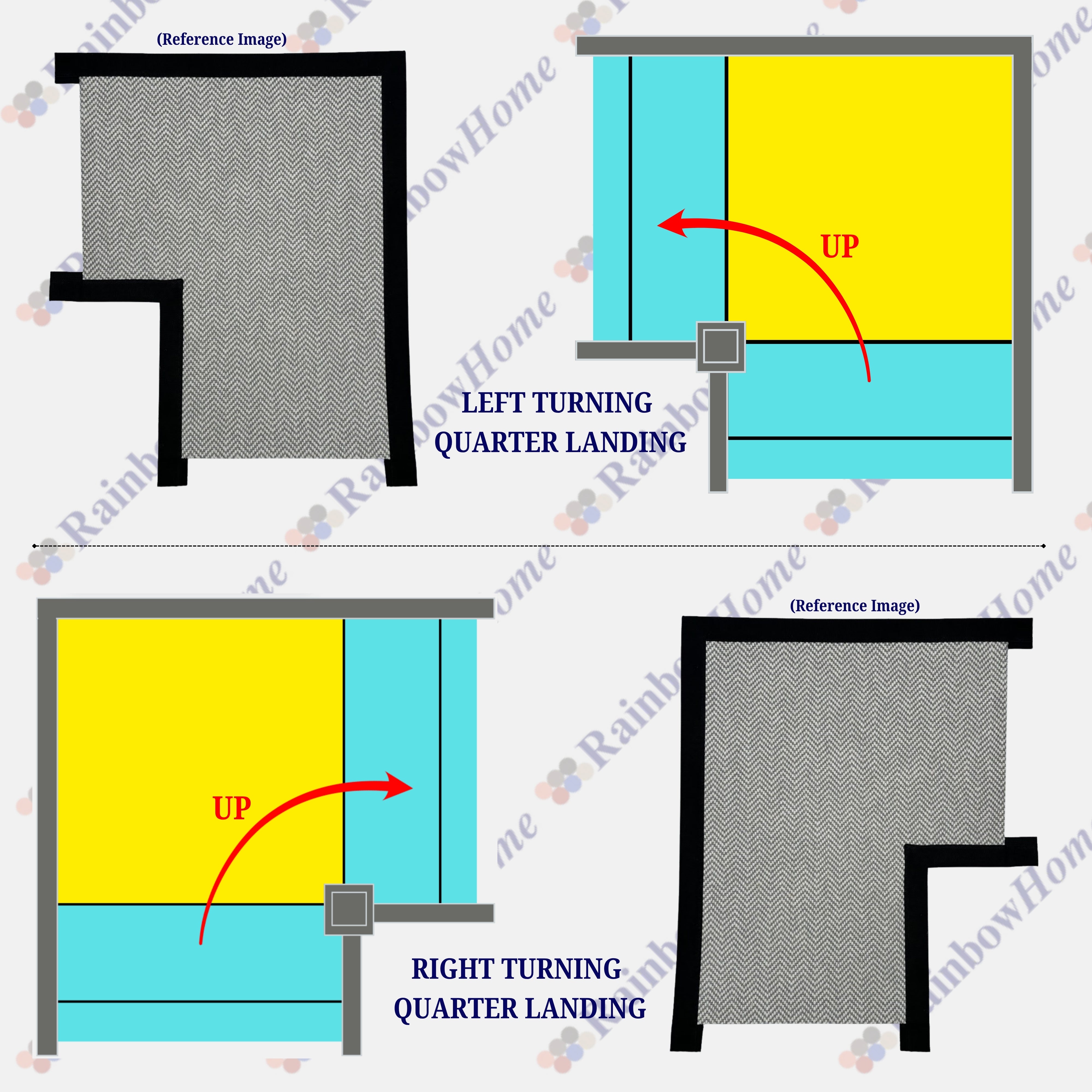 We also offer Winder Step panels and Quarter Landing panels that perfectly match straight stair runner panels, allowing for a seamless finish on turning winder steps. Our winder step panel set includes the middle and upper steps, with each panel consisting of a riser and a tread. For the lower step, you can simply use a standard straight panel.