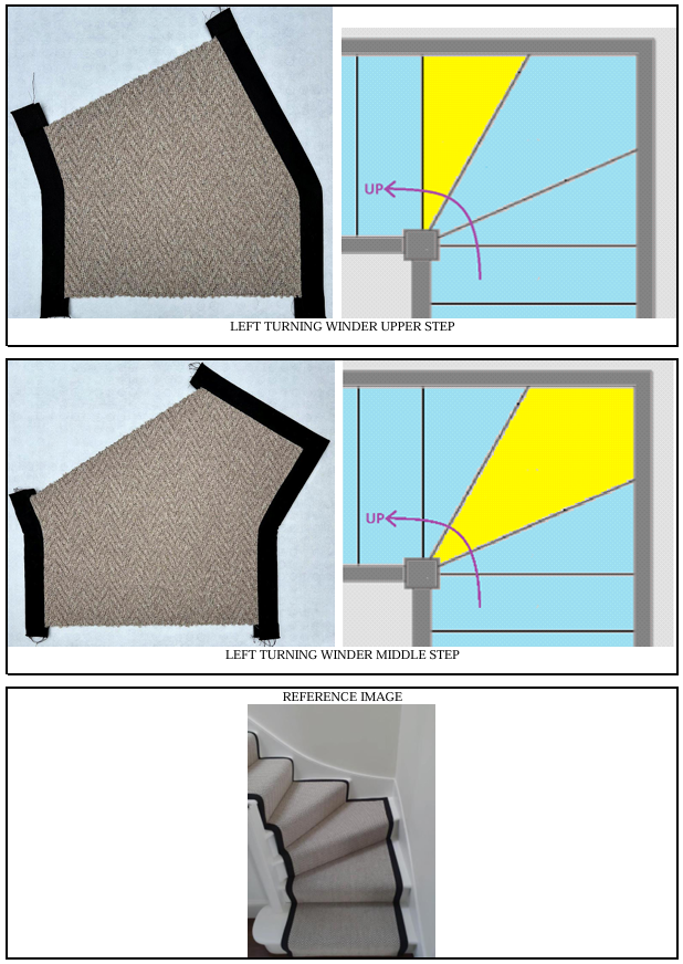 We also offer Winder Step panels and Quarter Landing panels that perfectly match straight stair runner panels, allowing for a seamless finish on turning winder steps. Our winder step panel set includes the middle and upper steps, with each panel consisting of a riser and a tread. For the lower step, you can simply use a standard straight panel.