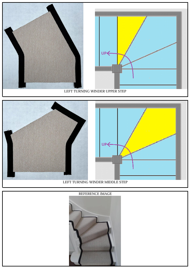We also offer Winder Step panels and Quarter Landing panels that perfectly match straight stair runner panels, allowing for a seamless finish on turning winder steps. Our winder step panel set includes the middle and upper steps, with each panel consisting of a riser and a tread. For the lower step, you can simply use a standard straight panel.