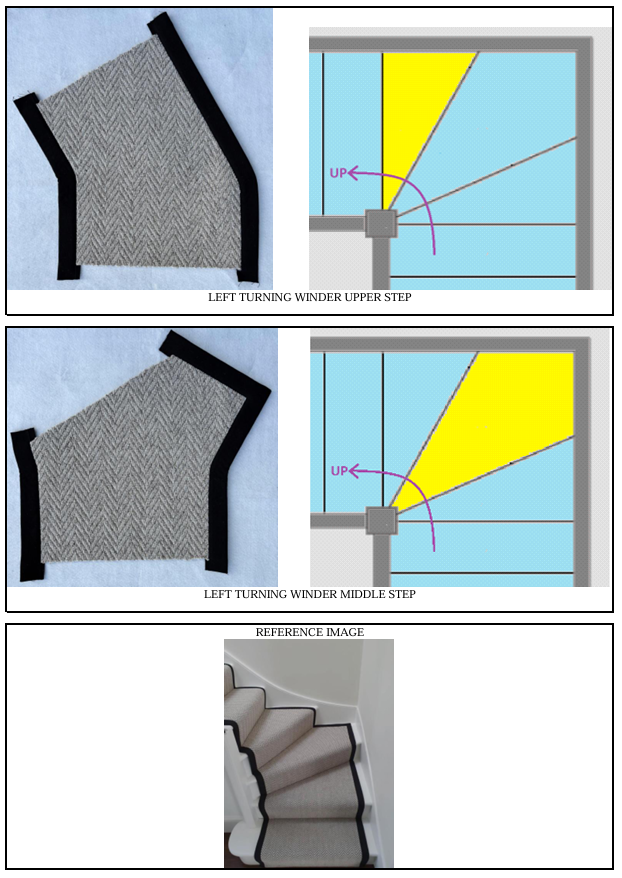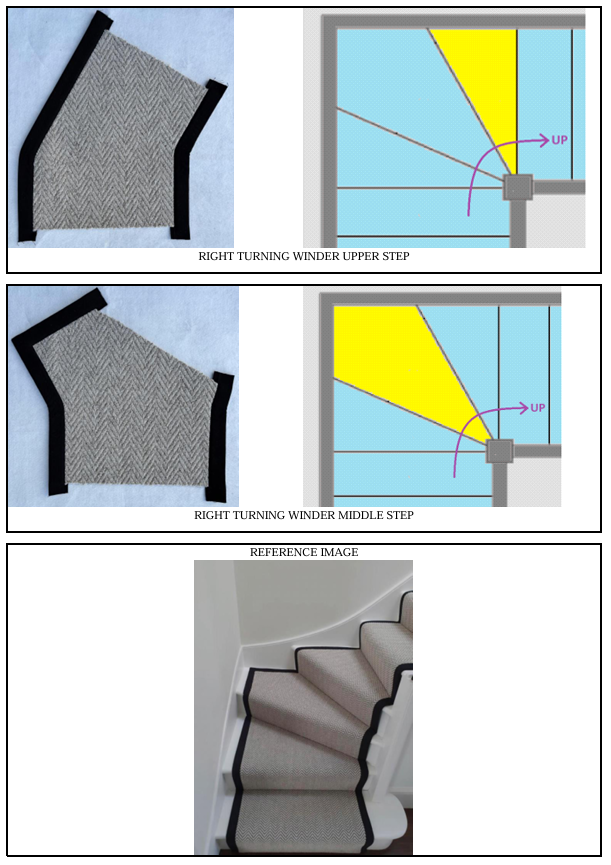 We also offer Winder Step panels and Quarter Landing panels that perfectly match straight stair runner panels, allowing for a seamless finish on turning winder steps. Our winder step panel set includes the middle and upper steps, with each panel consisting of a riser and a tread. For the lower step, you can simply use a standard straight panel.